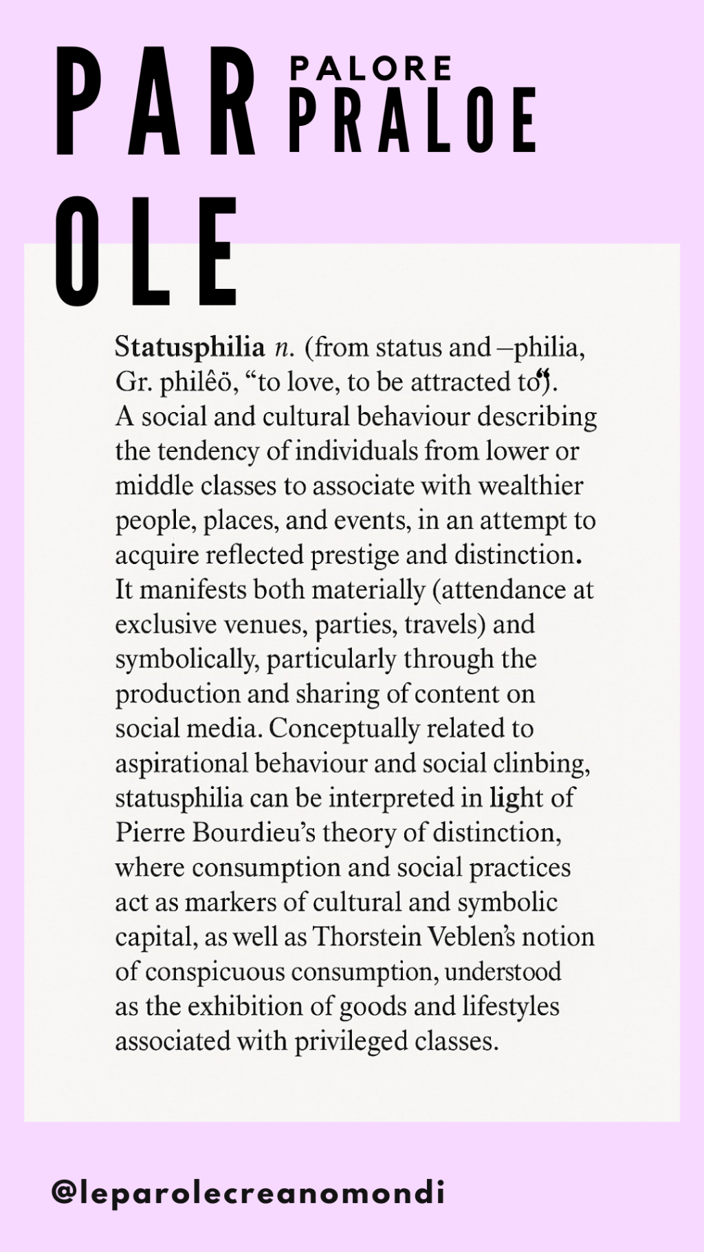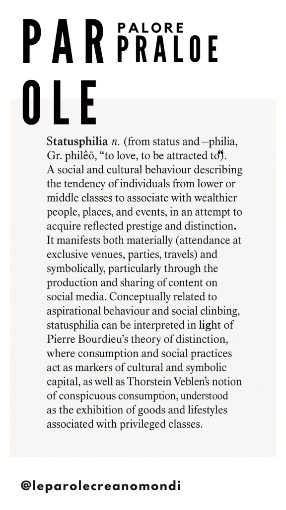 Statusphilia: un comportamento sociale che riflette il desiderio di appartenenza a cerchie privilegiate. Questo fenomeno, che si manifesta nel desiderio di associare la propria immagine a persone, eventi e luoghi di prestigio, è alimentato dalle dinamiche dei social media e dalla ricerca di status. Spesso legato alla teoria della distinzione di Pierre Bourdieu e alla nozione di consumo vistoso di Thorstein Veblen, la statusphilia descrive come l’esposizione a beni e stili di vita elitari diventi un simbolo di capitale culturale e sociale. Un’analisi della cultura contemporanea e delle sue gerarchie invisibili.
